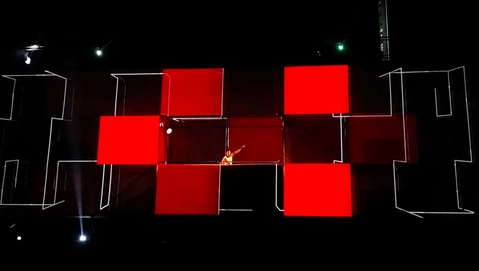 The vision was to create a performance that was part music festival, part explosive light show. We crafted twenty minutes of high-energy motion graphic content that was projected on four layers of scrim-lined surfaces surrounding the DJ booth.